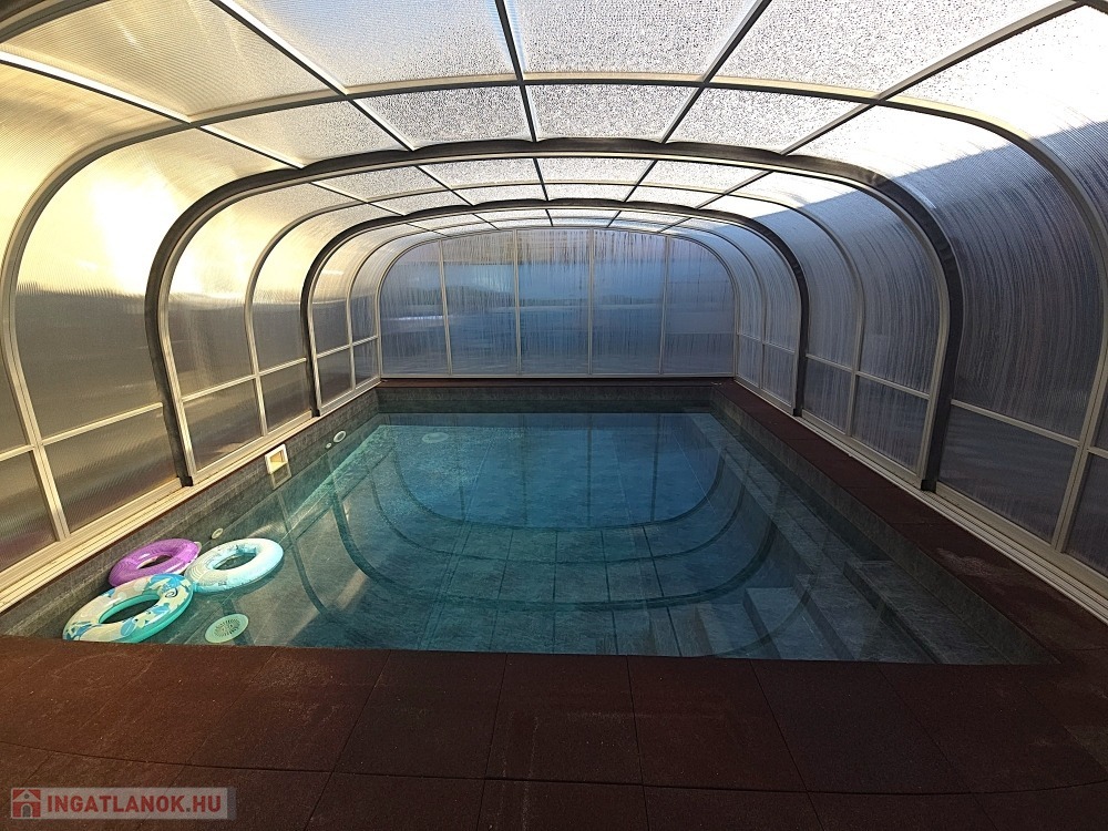 A kert központi eleme a nagy, vízforgatós, hidromasszázsos medence, amely fűtő és hűtő így egész évben élvezhető.