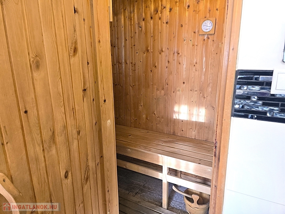 A fenti fürdőszoba kádas és zuhanyzós kialakítású, piszoárral és beépített szaunával, a wellnes-élmény otthon is adott.