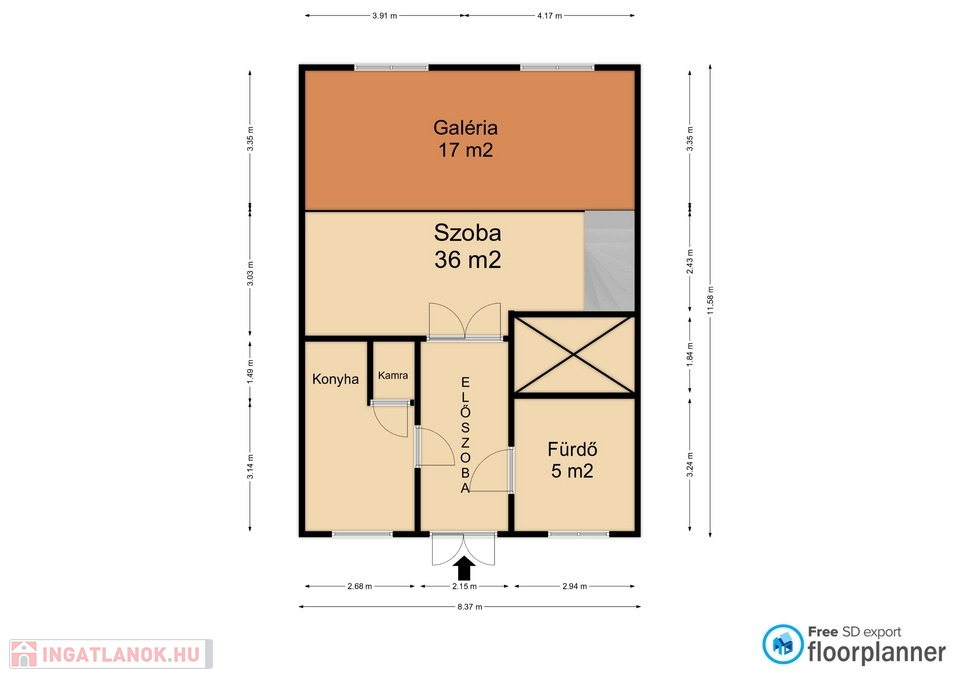 A lakás alapterülete 57 m2 + 18 m2 álló galéria. Jelenlegi kialakítása konyha - étkező egy légtérben, a fürdő és wc külön van. 1 hatalmas szoba van, ami 36 m2 és felett egy 18 m2-es álló galéria, amelyekből könnyedén kialakítható akár 2 külön nyíló 16 m2-es, plusz galériás szoba.