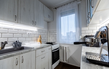 Az igényesen kialakított, világos konyha esztétikus és praktikus, a lakás erkélye pedig kellemes kiegészítő tere a mindennapoknak, ideális pihenésre vagy kikapcsolódásra.